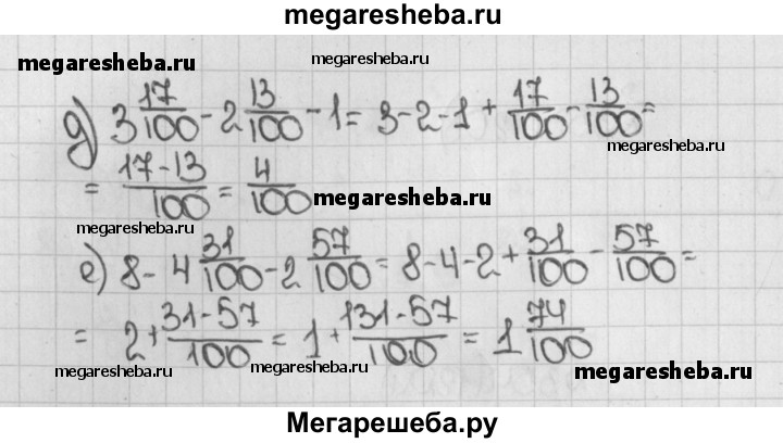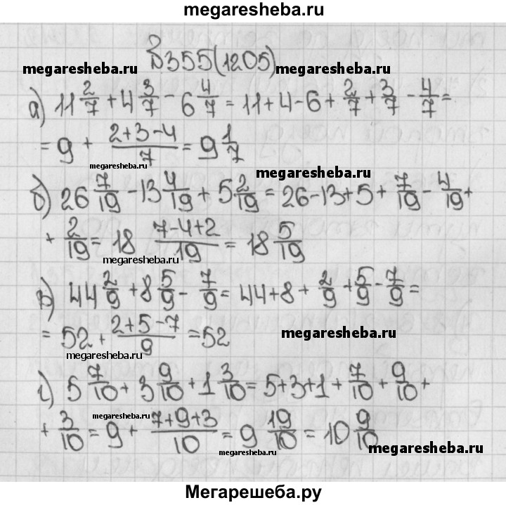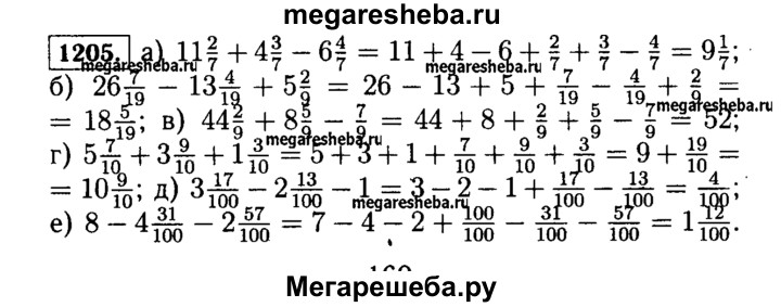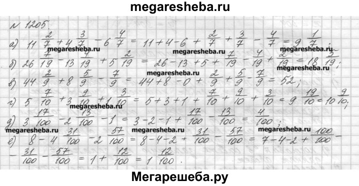 1205. Выполните действия: а)11 2/7 + 4 3/7 – 6 4/7 б) 26 7/19 – 13 4/19 + 5 2/19 в)44 2/9 + 8 5/9 – 7/9 г)5 7/10 + 3 9/10 + 1 1/10 д) 3 17/100- 2 13/100 - 1 е)8 – 4 31/100 – 2 57/100;