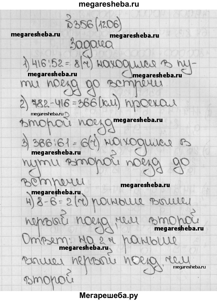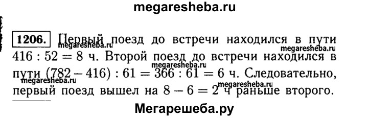 1206. Два поезда вышли в разное время навстречу друг другу из двух городов, расстояние между которыми 782 км. Скорость первого поезда 52 км/ч, а второго 61 км/ч. Пройдя 416 км, первый поезд встретился со вторым. На сколько один из поездов вышел раньше другого?