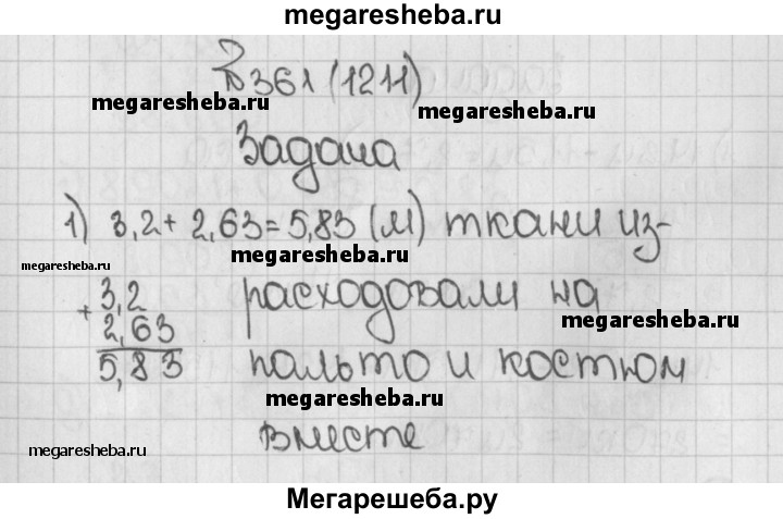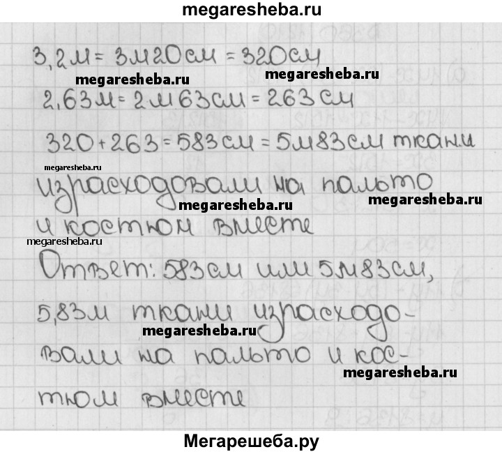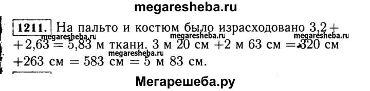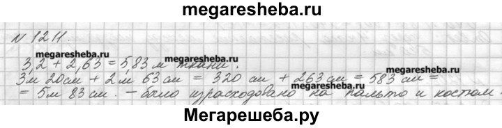 1211. На пальто израсходовали 3,2 м ткани, а на костюм — 2,63 м. Сколько ткани израсходовали на пальто и костюм вместе? Решите задачу сложением десятичных дробей и путём перехода к сантиметрам.