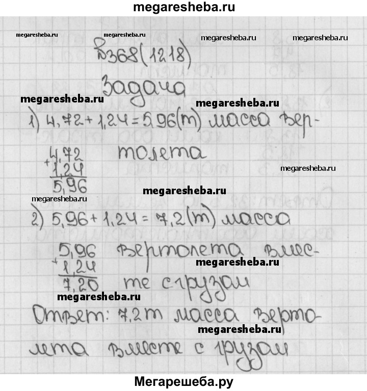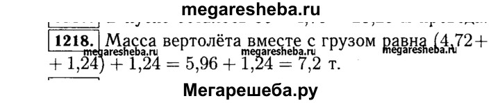 1218. Груз, поднимаемый вертолётом, легче вертолёта на 4,72 т. Какова масса вертолёта вместе с грузом, если масса груза 1,24 т?