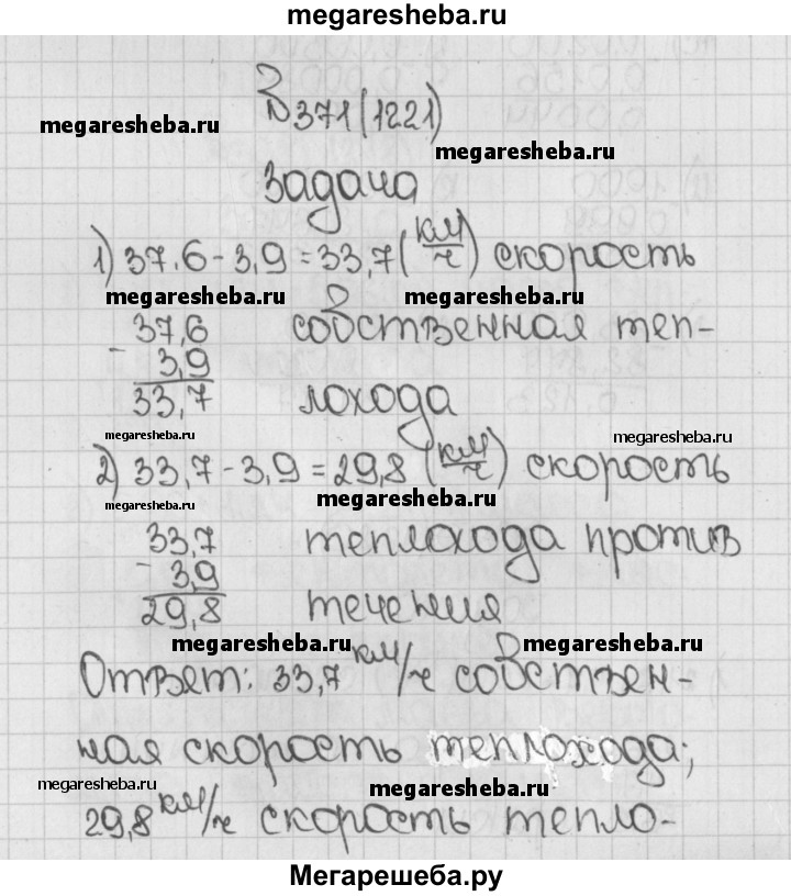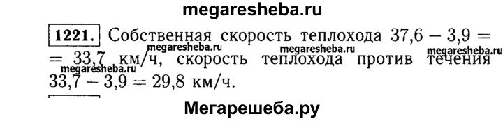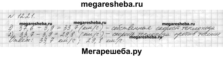 1221. Скорость теплохода по течению равна 37,6 км/ч. Найдите собственную скорость теплохода и его скорость против течения, если скорость течения реки 3,9 км/ч.