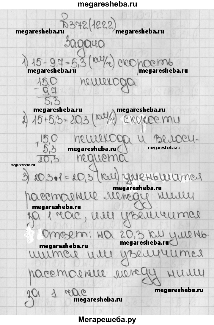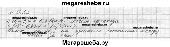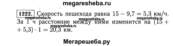1222. Скорость велосипедиста 15 км/ч, а скорость пешехода на 9,7 км/ч меньше. На сколько уменьшится расстояние между ними за 1 ч, если они движутся навстречу друг другу? На сколько увеличивается расстояние между ними за 1 ч, если они движутся из одной точки в противоположные стороны?