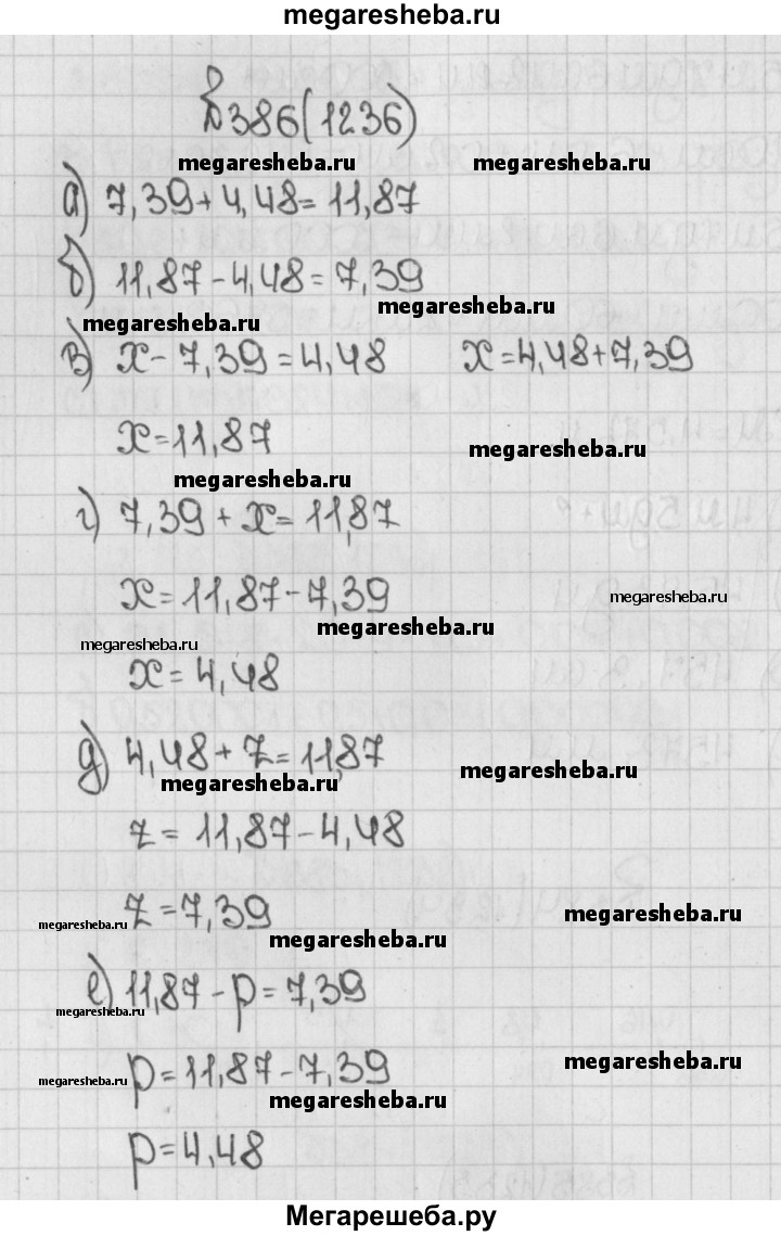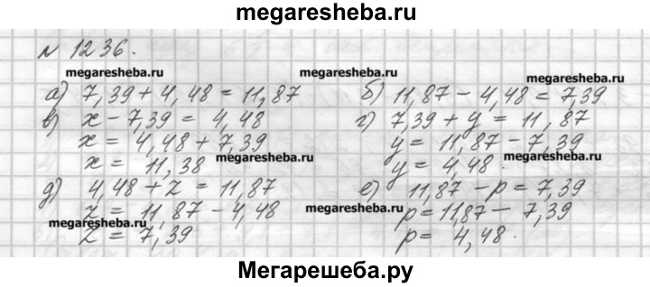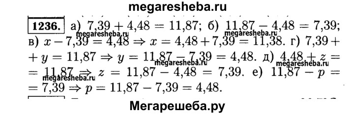 1236. Зная, что 11,87 - 7,39 = 4,48, найдите значение выражения или решите уравнение: а)7,39 + 4,48; г) 7,39 + у = 11,87; б)11,87 - 4,48; д) 4,48 + z = 11,87; в)x - 7,39 = 4,48; е) 11,87 - р = 7,39.