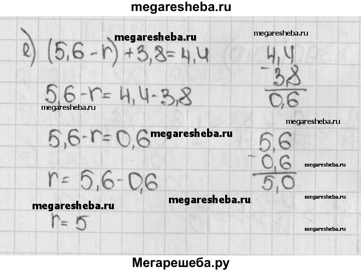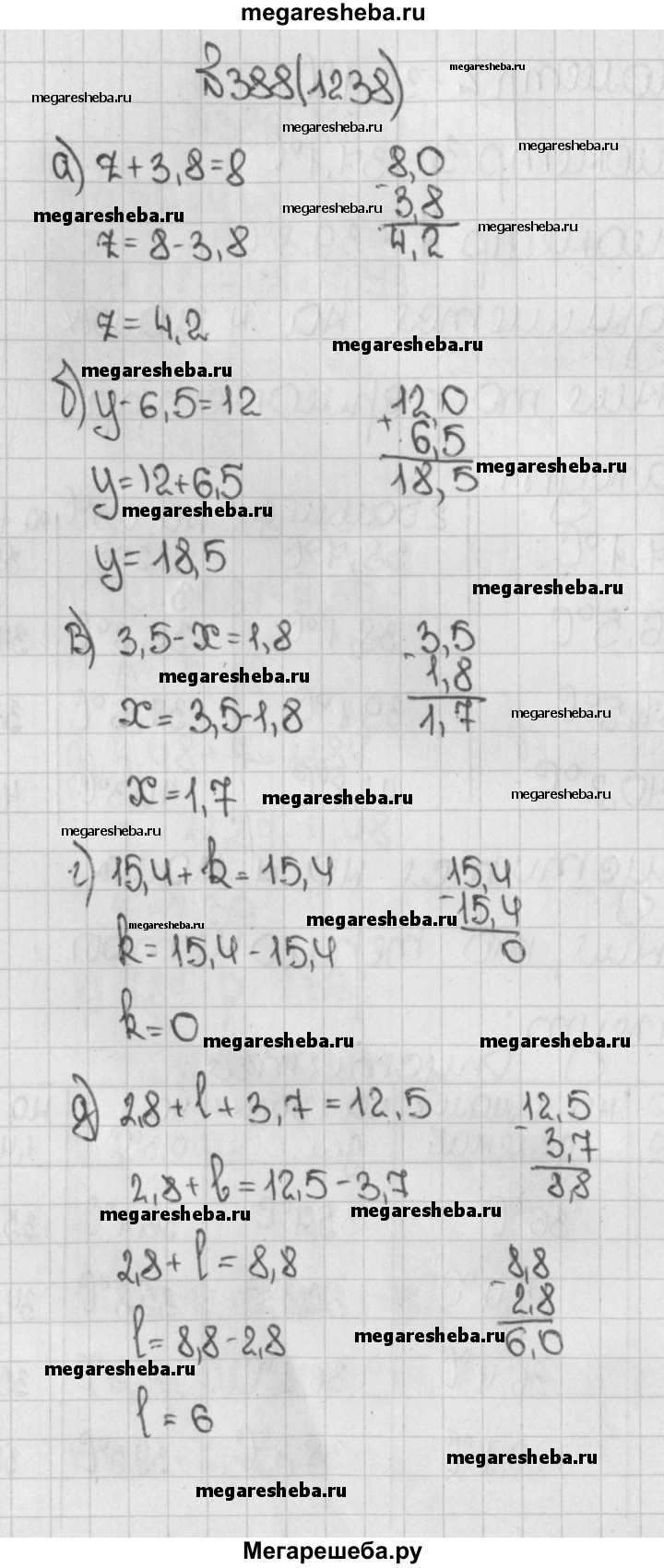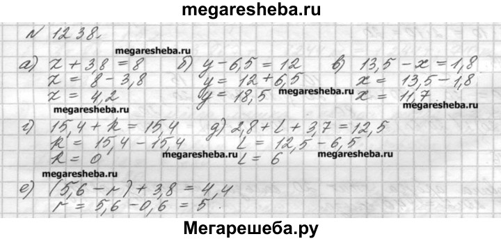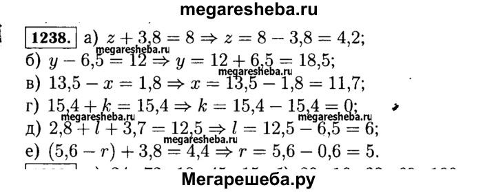 1238. Решите уравнение: а)2 + 3,8 = 8; б)у - 6,5 = 12; в)13,5 - х = 1,8; г)15,4 + k = 15,4; д)2,8 + / + 3,7 = 12,5; е)(5,6 - г) + 3,8 = 4,4.