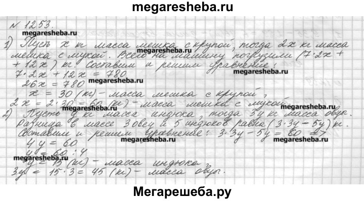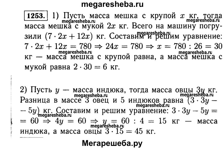 1253. Решите задачу: 1) На машину погрузили 7 одинаковых мешков с мукой и 12 одинаковых мешков с крупой. Масса мешка с мукой в 2 раза больше массы мешка с крупой. Найдите массу мешка с мукой и мешка с крупой, если всего на машину погрузили 780 кг. 2) Масса индюка меньше массы овцы в 3 раза, а масса трёх таких овец больше массы пяти индюков на 60 кг. Какова масса одного индюка и какова масса одной овцы?