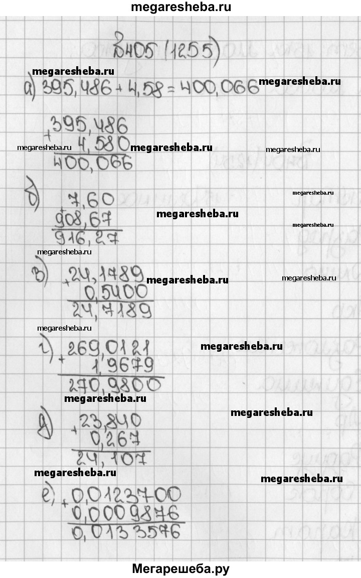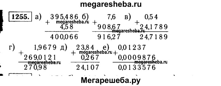 1255. Выполните сложение: а) 395,486 + 4,58; г) 1,9679 + 269,0121; б) 7,6 + 908,67; д) 23,84 + 0,267; в) 0,54 + 24,1789; е) 0,01237 + 0,0009876.