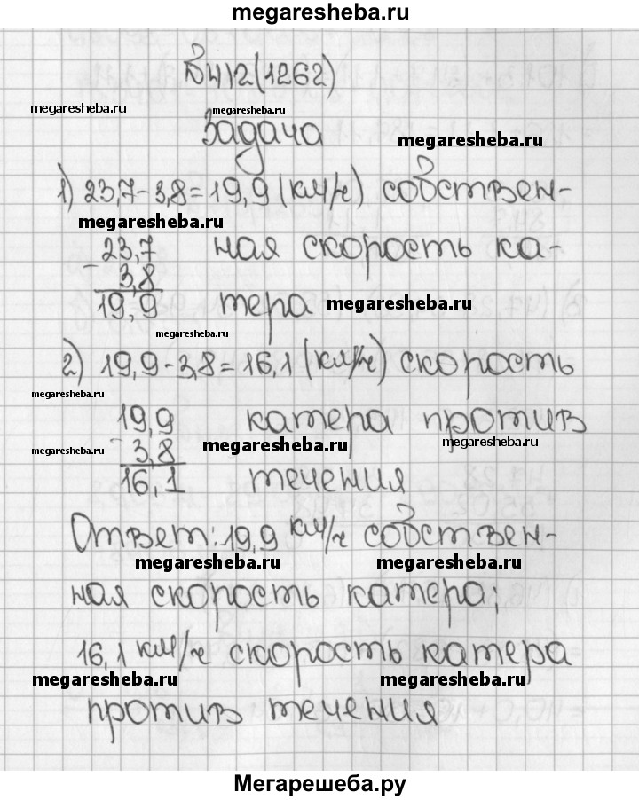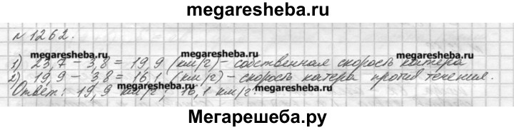 1262. Скорость катера по течению 23,7 км/ч. Найдите собственную скорость катера и его скорость против течения, если скорость течения 3,8 км/ч.