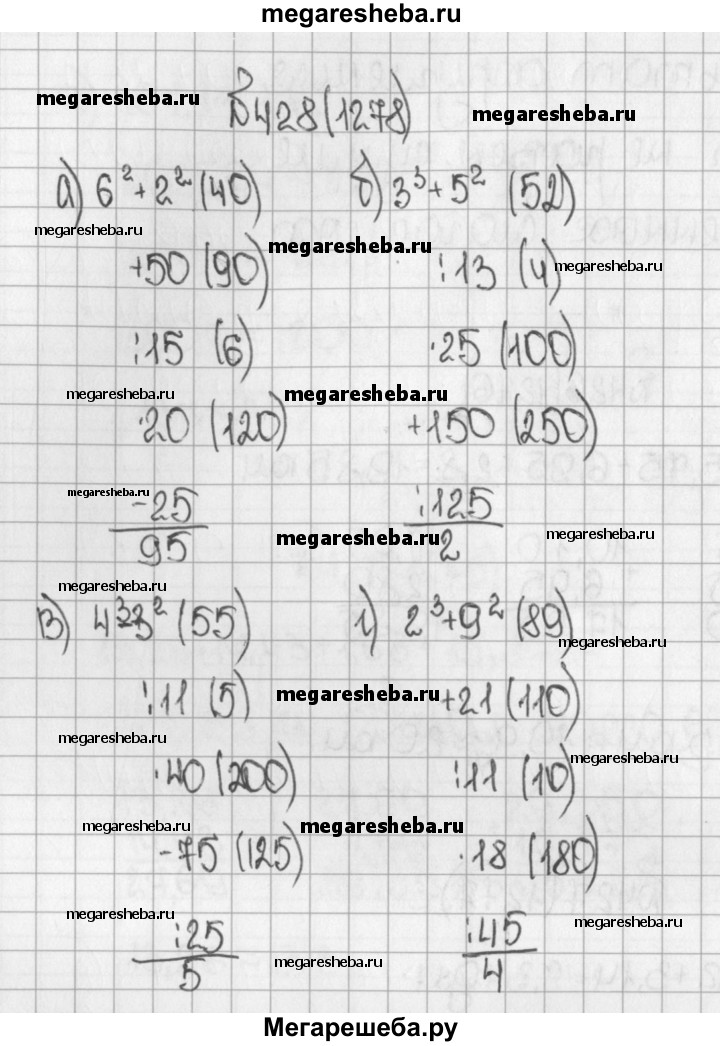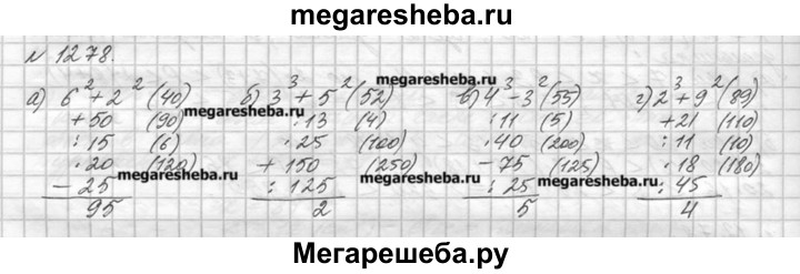 1278. Вычислите устно: а) б2 + 22+ 50:15* 20- 25/? б) З3 + 52: 13-25+ 150: 125/? в) 43 - З2: 11-40- 75: 25/? г) 23 + 92+21: 11-18: 45/?