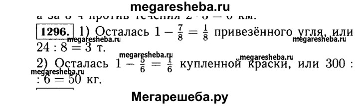 1296. Решите задачу: 1)В школу завезли 24 т угля. За зиму израсходовали 7/8 привезённого угля. Сколько тонн угля осталось? 2) Маляры израсходовали 5/6 купленной краски для ремонта школы. Сколько краски осталось, если купили её 300 кг?