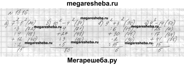 1316. Вычислите устно: а) 72-52* 3: 4+ 12: 2/? б) 102 – 42: 4+ 27: 3* 5/? в) 92 + З2: 6+ 30* 2:15/? г) 43 - 14 : 25 * 17 + 41 : 15/?