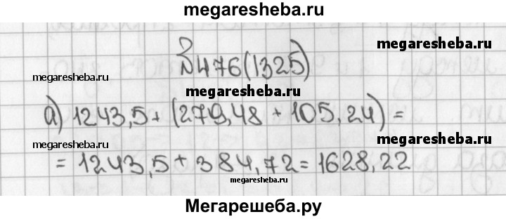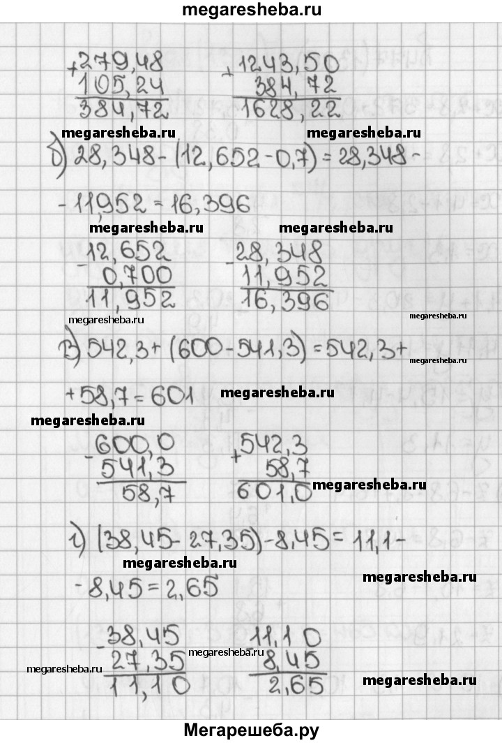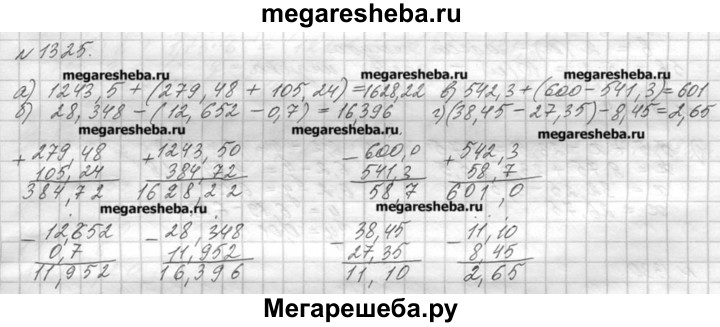 1325. Выполните действия: а)1243,5 + (279,48 + 105,24); в) 542,3 + (600 - 541,3); б)28,348 - (12,652 - 0,7); г) (38,45 - 27,35) - 8,45.