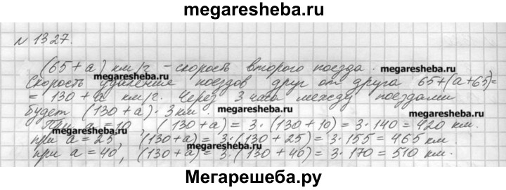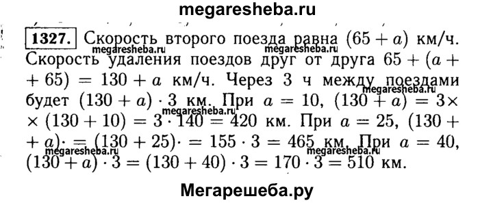 1327. С одной станции в противоположных направлениях вышли два поезда в одно и то же время. Скорость одного поезда 65 км/ч, а скорость другого на a км/ч больше. Какое расстояние будет между поездами через 3 ч? Составьте выражение для решения задачи и найдите его значение при a = 10; 25; 40.