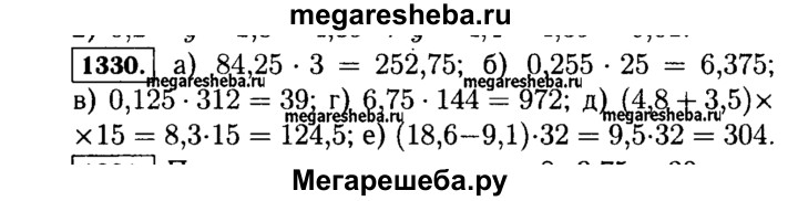 1330. Найдите значение выражения: а) 84,25 * 3; в) 0,125 * 312; д) (4,8 + 3,5) * 15; б) 0,255 -28; г) 6,75 * 144; е) (18,6 - 9,1) * 32.