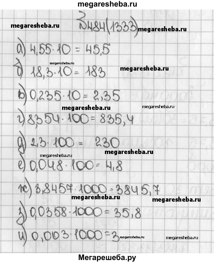 1333. Найдите значение произведения: а) 4,55 * 10; г) 8,354 * 100; б) 18,3 * 10; д) 2,3 * 100; в) 0,235 * 10; е) 0,048 * 100;