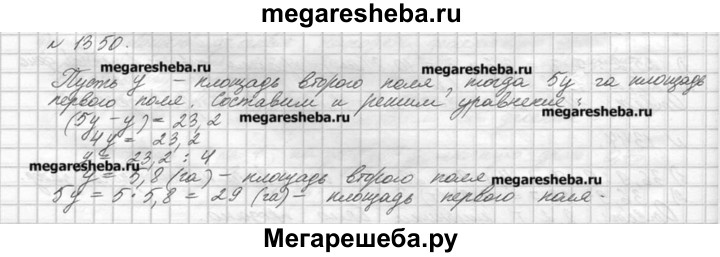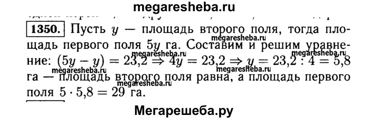 1350. Площадь первого поля в 5 раз больше площади второго. Чему равна площадь каждого поля, если площадь второго на 23,2 га меньше площади первого?