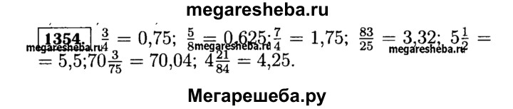 1354. Представьте в виде десятичной дроби: 3/4; 5/8; 7/4; 83/25; 5 1/2; 70 3/75; 4 21/84.