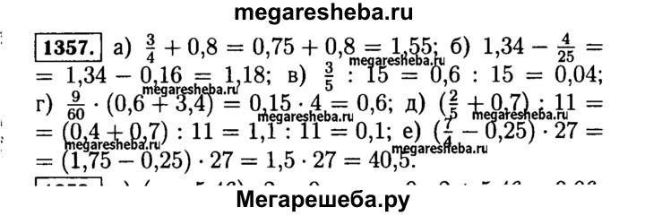 1357. Представьте обыкновенную дробь в виде десятичной и выполните действия: а)2 /3 + 0,8; б)1,34 – 4/25; в) 2/3 : 15 г)9/60 * (0,66+3,4) д)(2/5 + 0,7) : 11 е)(7/5 – 0,25) *27