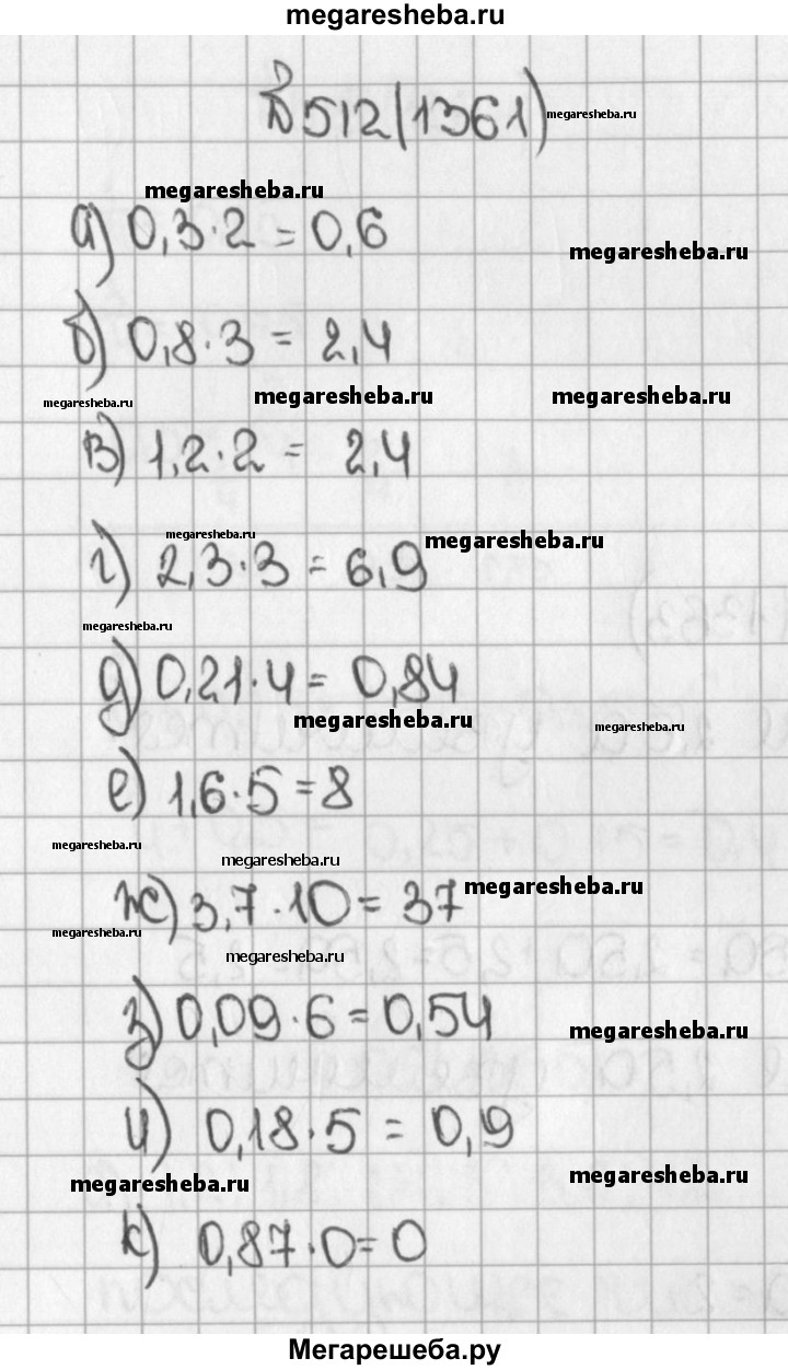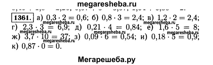 1361. Выполните умножение: а)0,3-2; б)0,8 * 3 ; в)1,2-2; г) 2,3 * 3; д) 0,21 * 4; е) 1,6 * 5; ж) 3,7 * 10; з) 0,09 * 6; и) 0,18 * 5; к) 0,87 * 0;