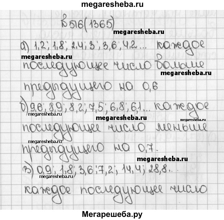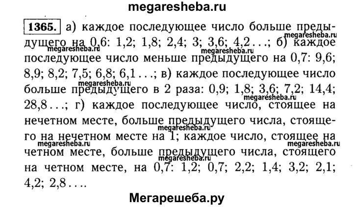 1365. Подумайте, по какому правилу составлен ряд чисел, и запишите ещё два числа этого ряда: а) 1,2; 1,8; 2,4; 3; ... в) 0,9; 1,8; 3,6; 7,2; ... б) 9,6; 8,9; 8,2; 7,5; ... г) 1,2; 0,7; 2,2; 1,4; 3,2; 2,1; ...
