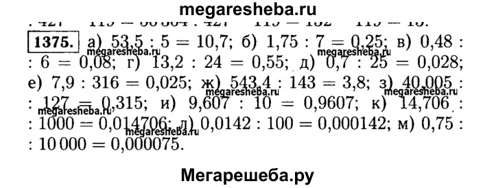 1375. Выполните деление: а) 53,5 : 5; д) 0,7 : 25; и) 9,607 : 10; б) 1,75 : 7; е) 7,9 : 316; к) 14,706 : 1000; в) 0,48 : 6; ж) 543,4 : 143; л) 0,0142 : 100; г) 13,2 : 24; з) 40,005 : 127; м) 0,75 : 10000.
