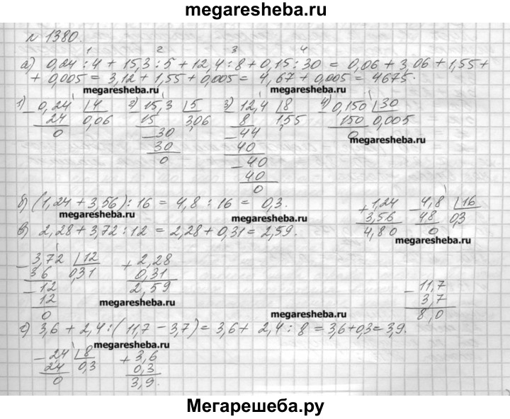 1380. Найдите значение выражения: а)0,24 : 4 + 15,3 : 5 + 12,4 : 8 + 0,15 : 30; б)(1,24+ 3,56) : 16; в)2,28 + 3,72 : 12; г)3,6 + 2,4 : (11,7 - 3,7).