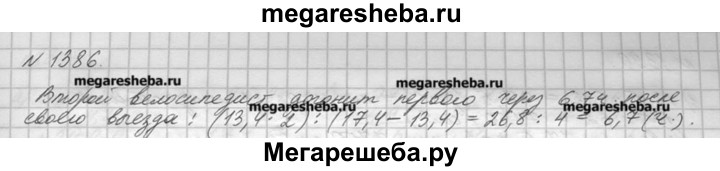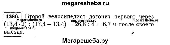 1386. Из города выехал велосипедист со скоростью 13,4 км/ч. Через 2 ч вслед за ним выехал другой велосипедист, скорость которого 17,4 км/ч. Через сколько часов после своего выезда второй велосипедист догонит первого?