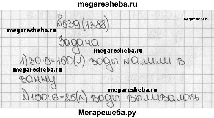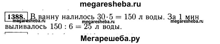 1388. Кран, который подаёт в минуту 30 л воды, за 5 мин наполнил ванну. Потом кран закрыли и открыли сливное отверстие, через которое вся вода вылилась за 6 мин. Сколько литров воды выливалось за 1 мин?