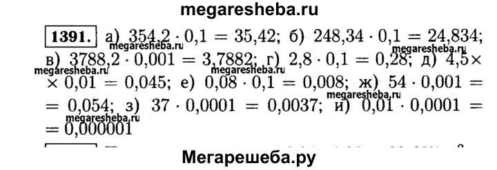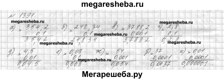 1391. Выполните умножение: а)354,2 * 0,1; г) 2,8 * 0,1; ж) 54 * 0,001; б)248,34 * 0,1; д) 4,5 * 0,01; з) 37 * 0,0001; в)3788,2 * 0,001; е) 0,08 * 0,1; и) 0,01 * 0,0001.