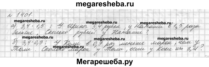 1401. Придумайте задачу, которая решалась бы умножением: а) 3,4 на 1,5; б) 3,4 на 0,9.
