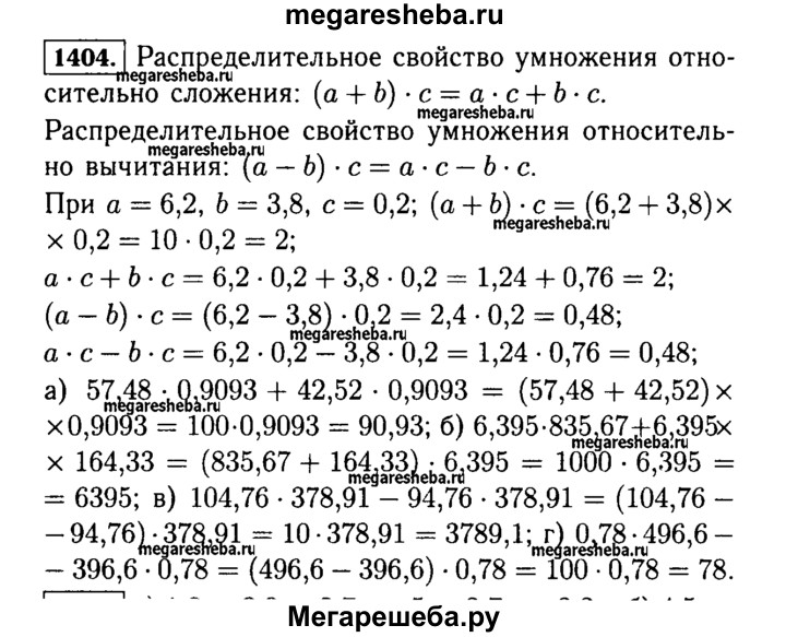 1404. Запишите с помощью букв а, Ь, с распределительное свойство умножения относительно сложения и относительно вычитания. Проверьте эти свойства при а = 6,2, b = 3,8, с = 0,2. Используя эти свойства, найдите значение выражения: а) 57,48 * 0,9093 + 42,52 * 0,9093; б) 6,395 * 835,67 + 6,395 * 164,33; в) 104,76 * 378,91 - 94,76 * 378,91; г) 0,78 * 496,6 - 396,6 * 0,78.