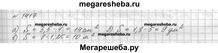 1417. Вычислите площадь прямоугольника, если его стороны равны: а) 3,5 см и 4 см; б) 1,8 дм и 5 дм; в) 8 м и 1,25 м.