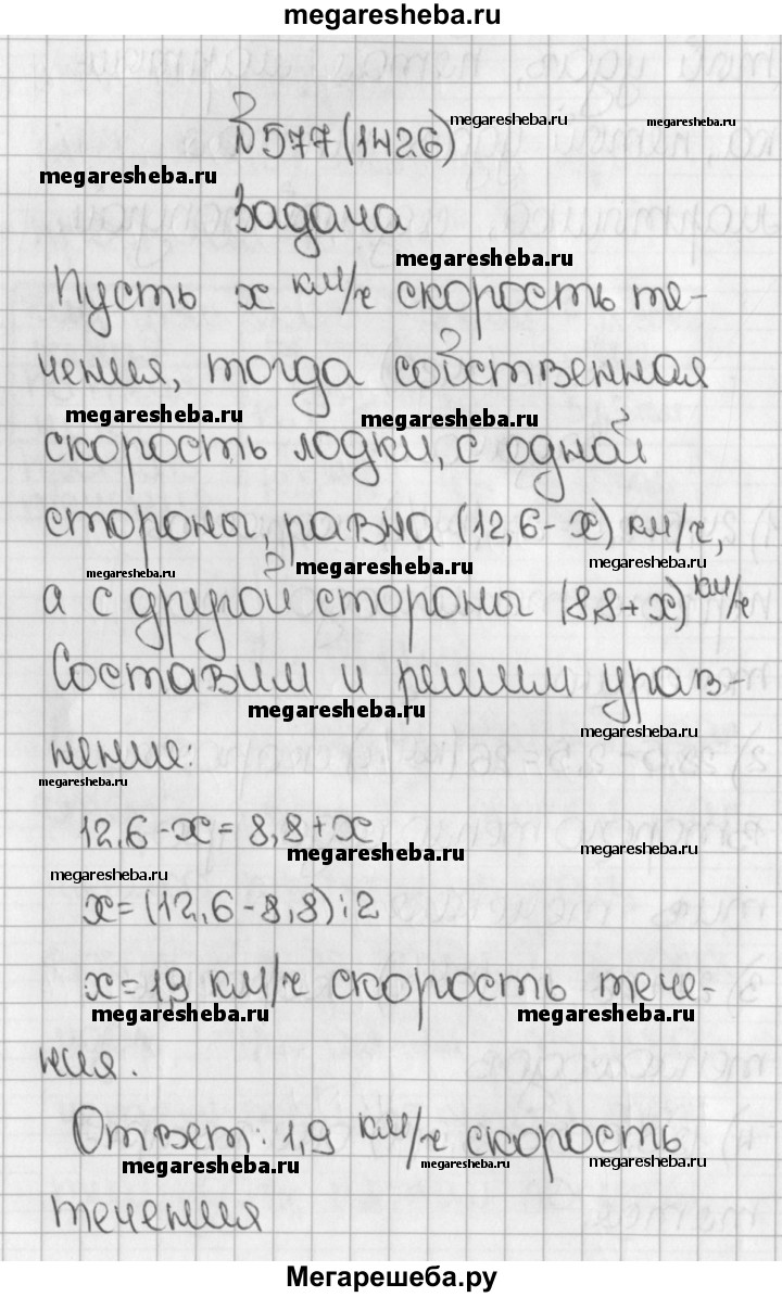 1426. Лодка шла по течению со скоростью 12,6 км/ч, а против течения — со скоростью 8,8 км/ч. Найдите скорость течения, зная, что собственная скорость лодки не изменялась.