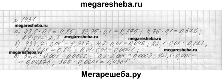 1431. Найдите значение произведения: а)48,5*0,1; 83,75-0,1; 5,76 * 0,1; 27-0,1; б)435,7 * 0,01; 4,2-0,01; 82,1 * 0,01; 82 *0,01; 0,01*0,01; в)56,2 * 0,001; 0,3*0,001; 427,5 * 0,0001; 365*0,0001.