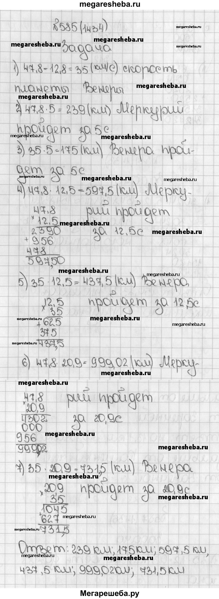 1434. Скорость планеты Меркурий при движении вокруг Солнца 47,8 км/с, а скорость планеты Венера на 12,8 км/с меньше. Какой путь пройдёт каждая планета за 5 с; за 12,5 с; за 20,9 с?