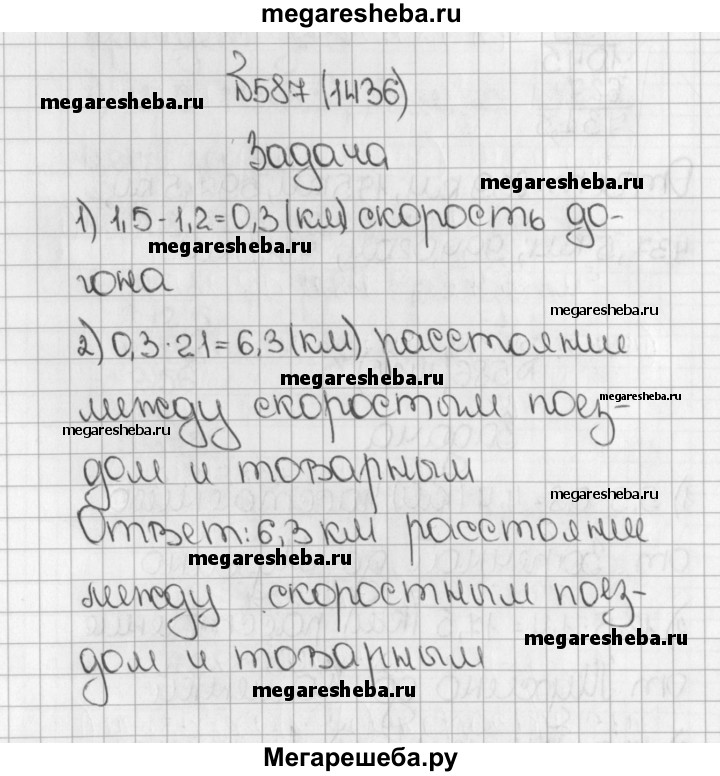 1436. Скорый поезд догонит товарный через 21 мин. Найдите расстояние между ними, если скорость товарного поезда 1,2 км/мин, а скорого 1,5 км/мин.