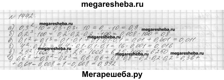1442. Найдите значение выражения: а) 0,32 * 10; в) 0,12 + 0,13; д) 2,52 * 1000; б) 0,23 * 100; г) 42 * 0,13; е) 0,62 + 0,82 - 0,23.