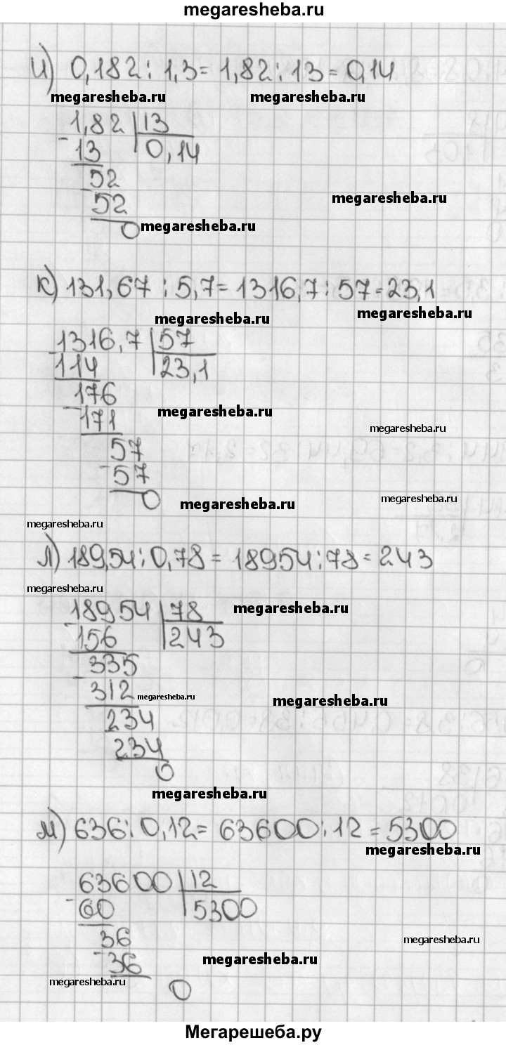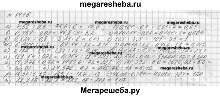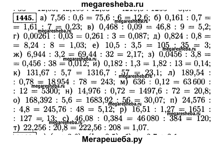 1445. Выполните деление: а) 7,56 : 0,6; ж) 6,944 : 3,2; н) 14,976 : 0,72; б) 0,161 : 0,7; з) 0,0456 : 3,8; о) 168,392 : 5,6; в) 0,468 : 0,09; и) 0,182 : 1,3; п) 24,576 : 4,8; г) 0,00261 : 0,03; к) 131,67 : 5,7; р) 16,51 : 1,27; д) 0,824 : 0,8; л) 189,54 : 0,78; с) 46,08 : 0,384; е) 10,5 : 3,5; м) 636 : 0,12; т) 22,256 : 20,8.