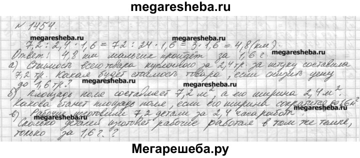 1454. За 2,4 ч мальчик прошёл 7,2 км. Сколько километров он пройдёт с той же скоростью за 1,6 ч? Придумайте задачи с теми же числами в условии и в ответе: а)про стоимость и количество товара; б)про площадь поля и урожай; в)про время работы и количество выпущенной продукции.