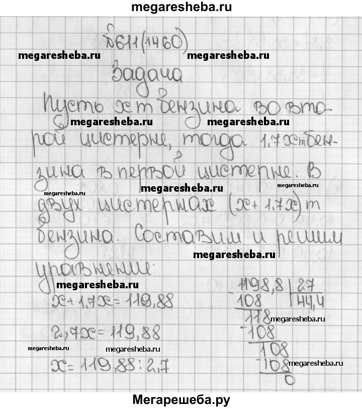 1460. В двух цистернах было 119,88 т бензина. В первой цистерне бензина было больше, чем во второй, в 1,7 раза. Сколько бензина было в каждой цистерне?