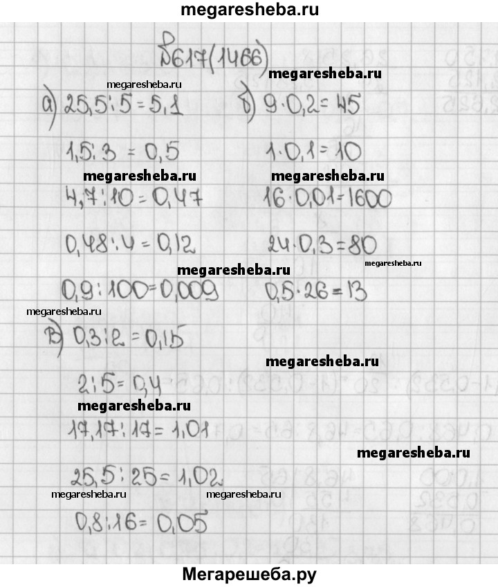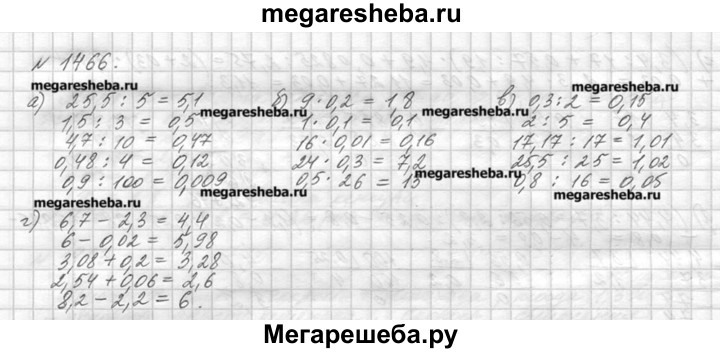 1466. Вычислите устно: а) 25,5 : 5; б) 9 * 0,2; в) 0,3 : 2; г) 6,7 - 2,3; 1,5 : 3; 1 * 0,1; 2:5; 6 - 0,02; 4,7:10; 16 * 0,01; 17,17:17; 3,08 + 0,2; 0,48 : 4; 24 * 0,3; 25,5 : 25; 2,54 + 0,06; 0,9:100; 0,5-26; 0,8:16; 8,2-2,2.