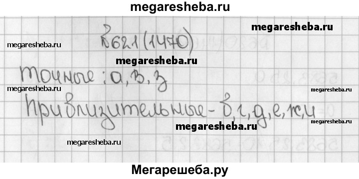 1470. Подумайте, какие из чисел могут быть точными, какие — приближёнными: а) в классе 32 ученика; б) расстояние от Москвы до Киева 900 км; в) у параллелепипеда 12 рёбер; г) длина стола 1,3 м; д) население Москвы 8 млн человек; е) в пакете 0,5 кг муки; ж) площадь острова Куба 105 000 км2; з) в школьной библиотеке 10 000 книг; и) одна пядь равна 4 вершкам, а вершок равен 4,45 см (вершок — длина фаланги указательного пальца).