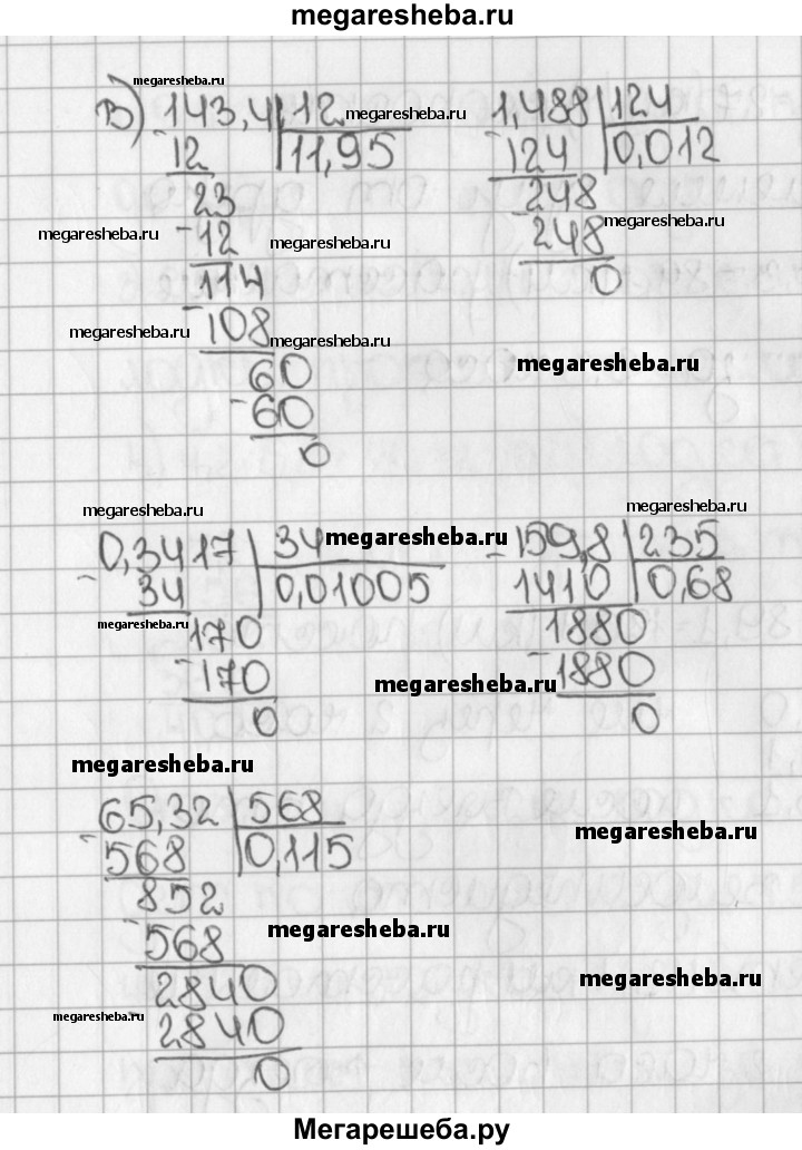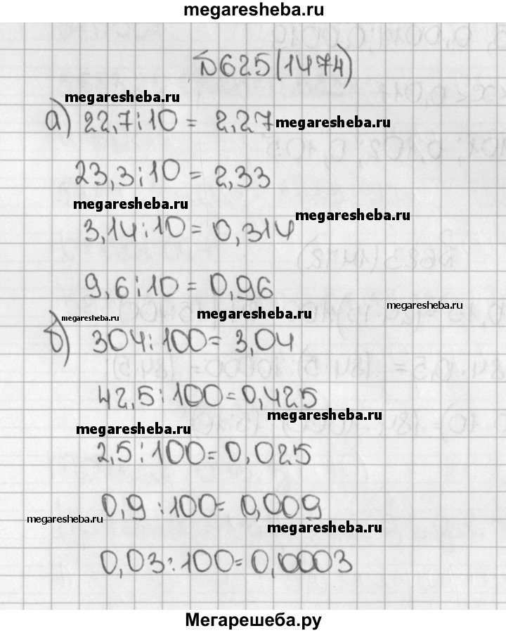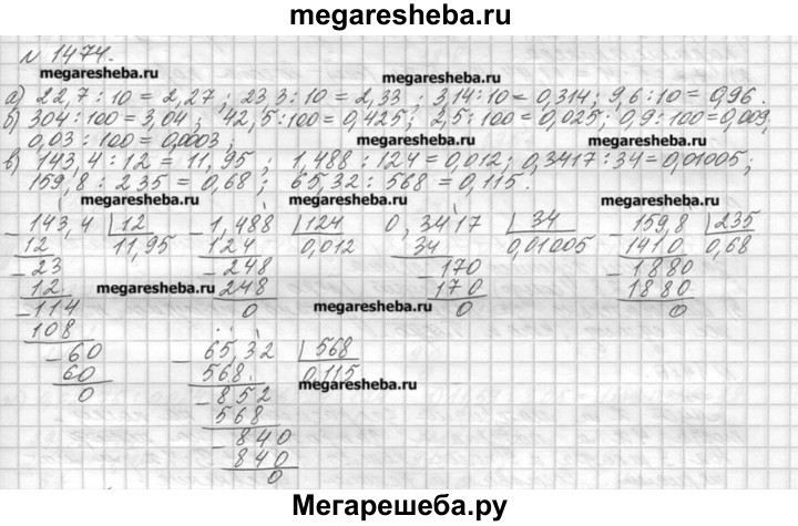 1474. Выполните деление: а) 22,7 : 10; 23,3 : 10; 3,14 : 10; 9,6 : 10; б) 304 : 100; 42,5 : 100; 2,5 : 100; 0,9 : 100; 0,03 : 100; в) 143,4 : 12; 1,488 : 124; 0,3417 : 34; 159,8 : 235; 65,32 : 568.