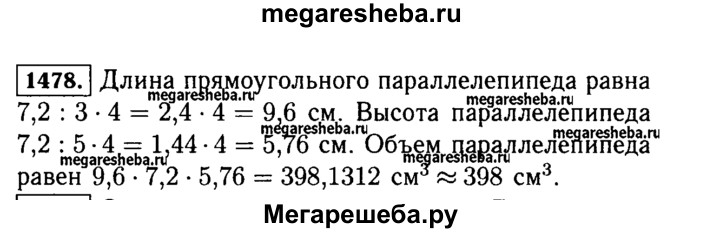 1478. Ширина прямоугольного параллелепипеда 7,2 см, что составляет 3/4 длины и 5/4 высоты. Найдите объём этого параллелепипеда и округлите ответ до целых.