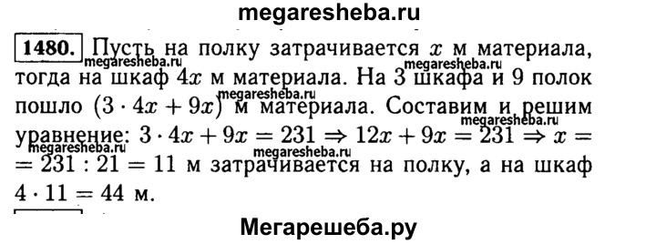 1480. На 3 шкафа и 9 книжных полок пошло 231 м досок, причём на шкаф идёт в 4 раза больше материала, чем на полку. Сколько метров досок идёт на шкаф и сколько — на полку?
