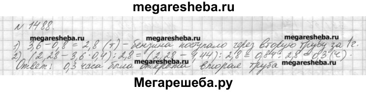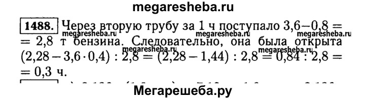 1488. В цистерну через две трубы налили 2,28 т бензина. Через первую трубу поступало 3,6 т бензина в час, и она была открыта 0,4 ч. Через вторую трубу поступало за час на 0,8 т бензина меньше, чем через первую. Сколько времени была открыта вторая труба?