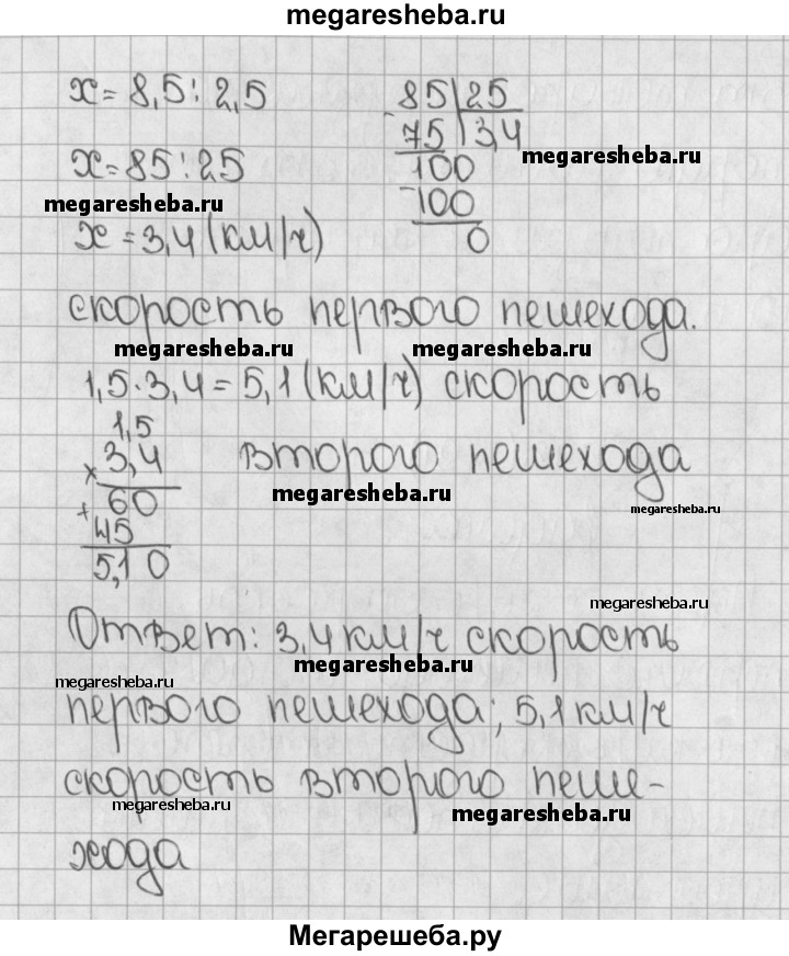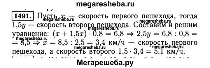 1491. Два пешехода вышли одновременно из одного места в противоположных направлениях. Через 0,8 ч расстояние между ними стало равным 6,8 км. Скорость одного пешехода была в 1,5 раза больше скорости другого. Найдите скорость каждого пешехода.
