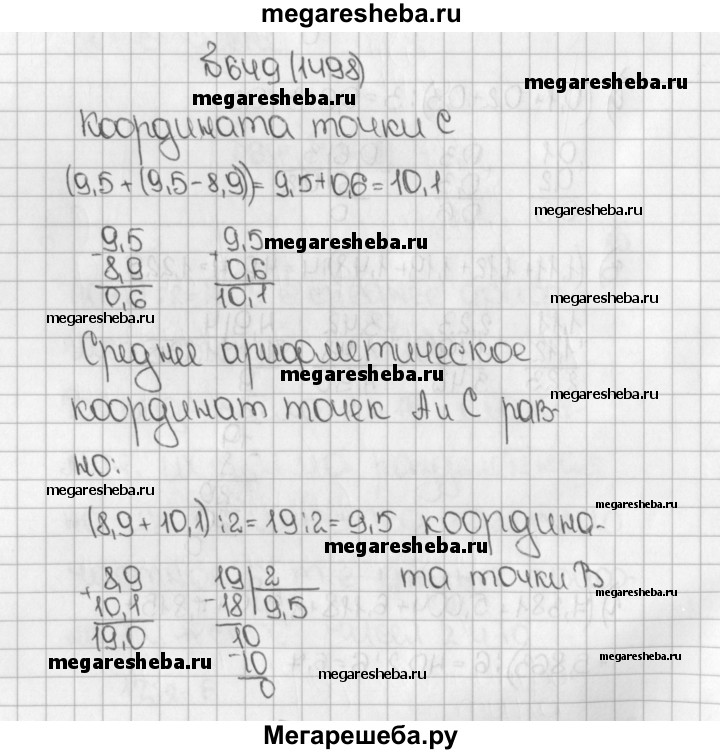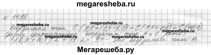 1498. На рисунке 153 АВ = ВС, где А(8,9) и В(9,5). Найдите координату точки С. Чему равно среднее арифметическое координат точек А и С?