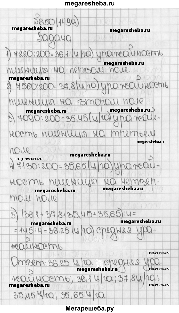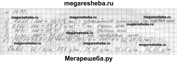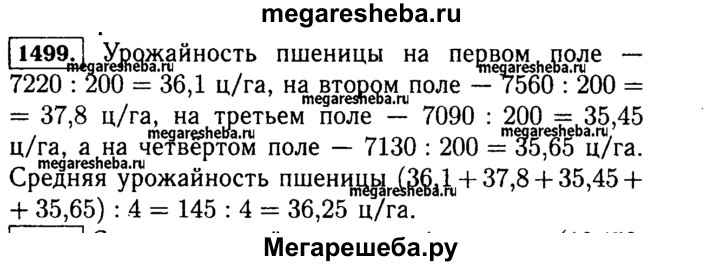 1499. Четыре поля имеют площадь по 200 га каждое. На первом поле собрали 7220 ц пшеницы, на втором — 7560 ц пшеницы, на третьем — 7090 ц пшеницы и на четвёртом — 7130 ц пшеницы. Определите урожайность пшеницы на каждом поле и найдите среднюю урожайность.
