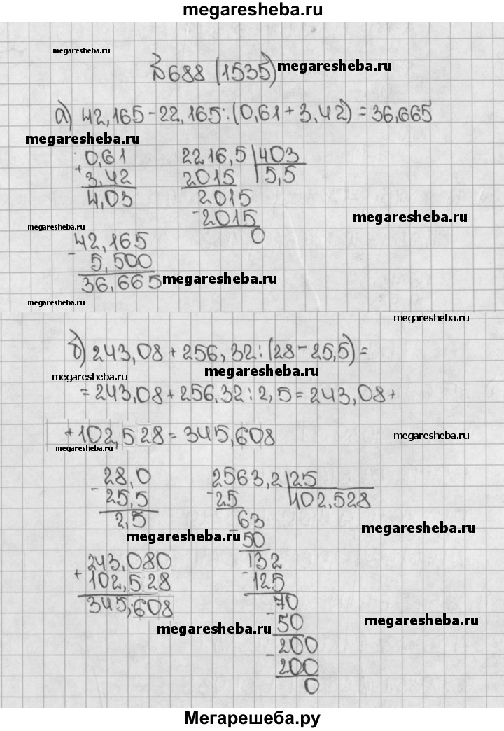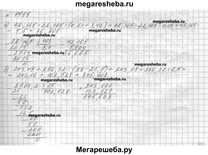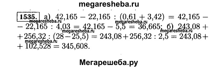 1535. Выполните действия: а) 42,165 - 22,165 : (0,61 + 3,42); б) 243,08 + 256,32 : (28 - 25,5).