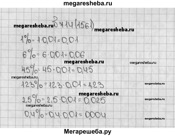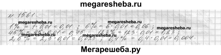 1561. Запишите в виде десятичной дроби: 1%; 6%; 45%; 123%; 2,5%; 0,4%.
